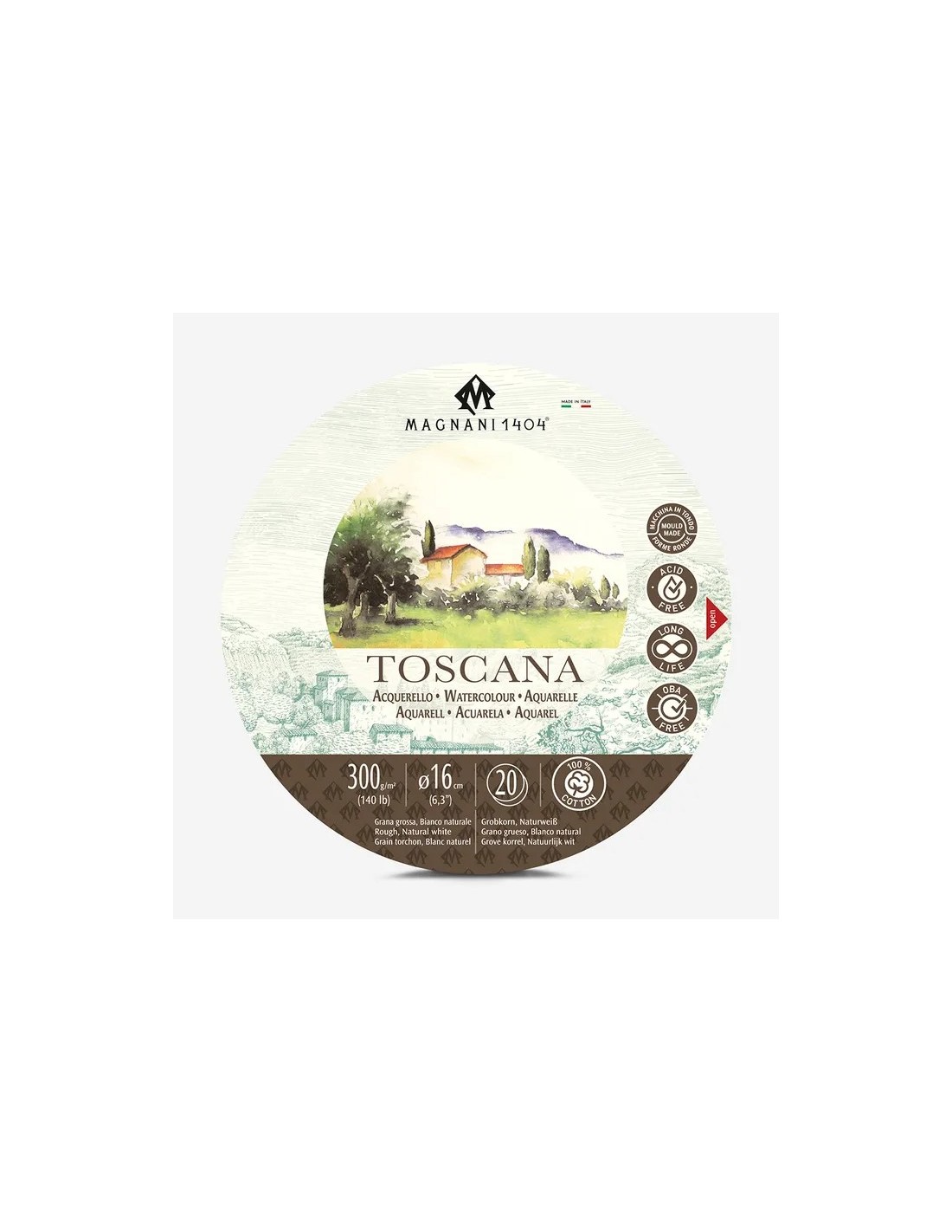 Block de acuarela Magnani 1404 fabricado con papel blanco natural, prensado en frío, 100% algodón, libre a ácido y cloro, con pH neutro. Hojas encoladas para crear una superficie estable que permite técnicas húmedas como acuarela, gouache, acrílico y tinta.