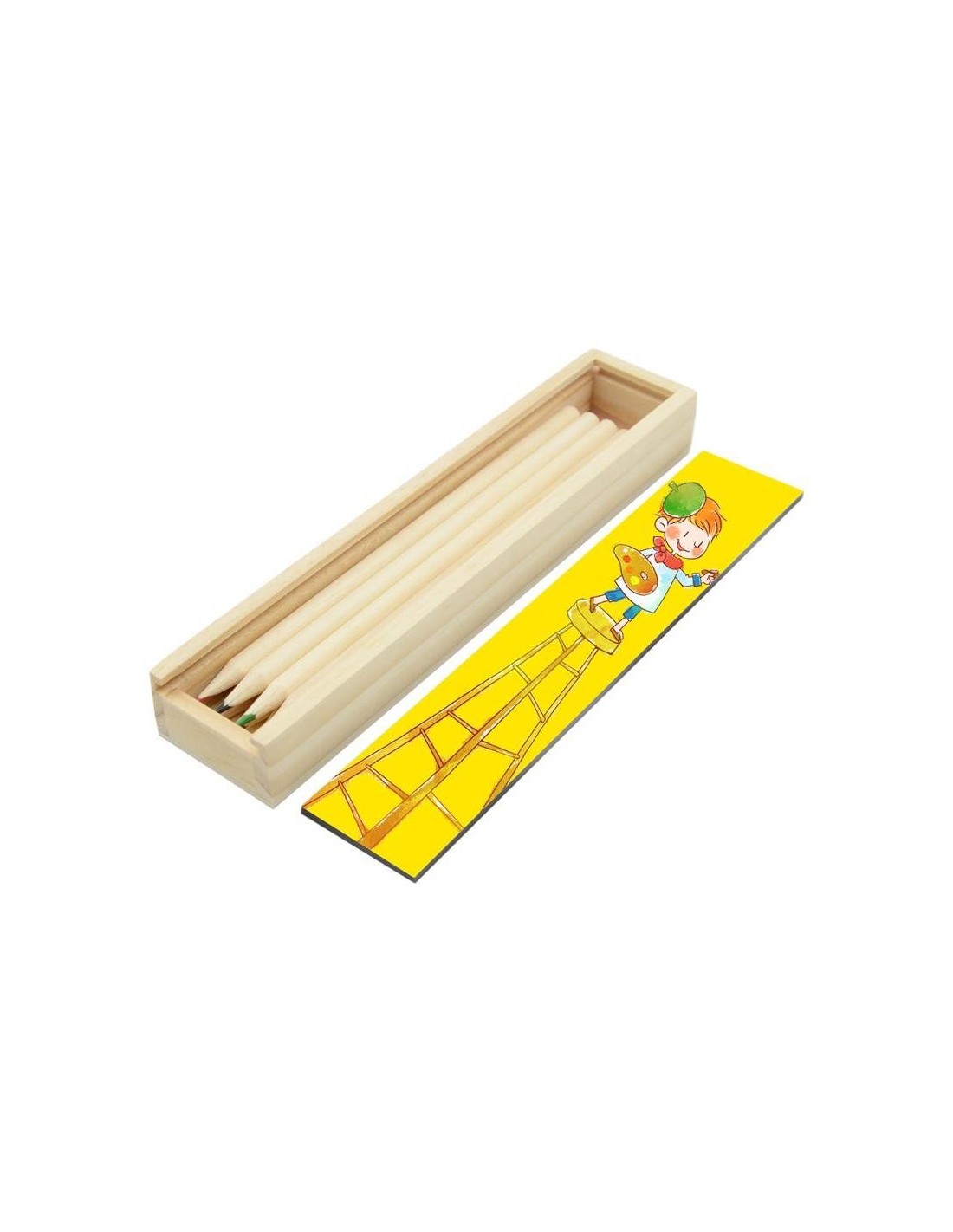 Estuche con tapa superior deslizable personalizable mediante sublimación, fabricado en madera con tapa superior de MDF blanco brillo. Incluye 8 lápices de colores. Su tamaño es de 205 x 42 x 24 mm.