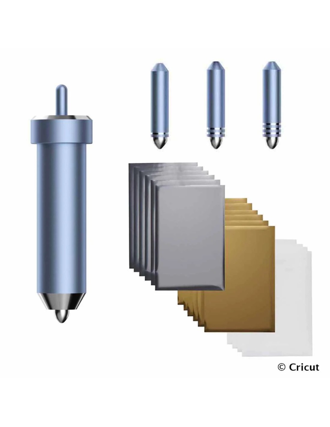 Permite añadir efectos foil a tus creaciones de la manera más fácil, segura y sencilla. Incluye portaherramientas, 3 Puntas intercambiables, una fina, una media y una gruesa, 12 hojas de Transfer Foil de 10.1 x 15.2 cm. Compatible con Cricut Maker y Explore Air 2.
