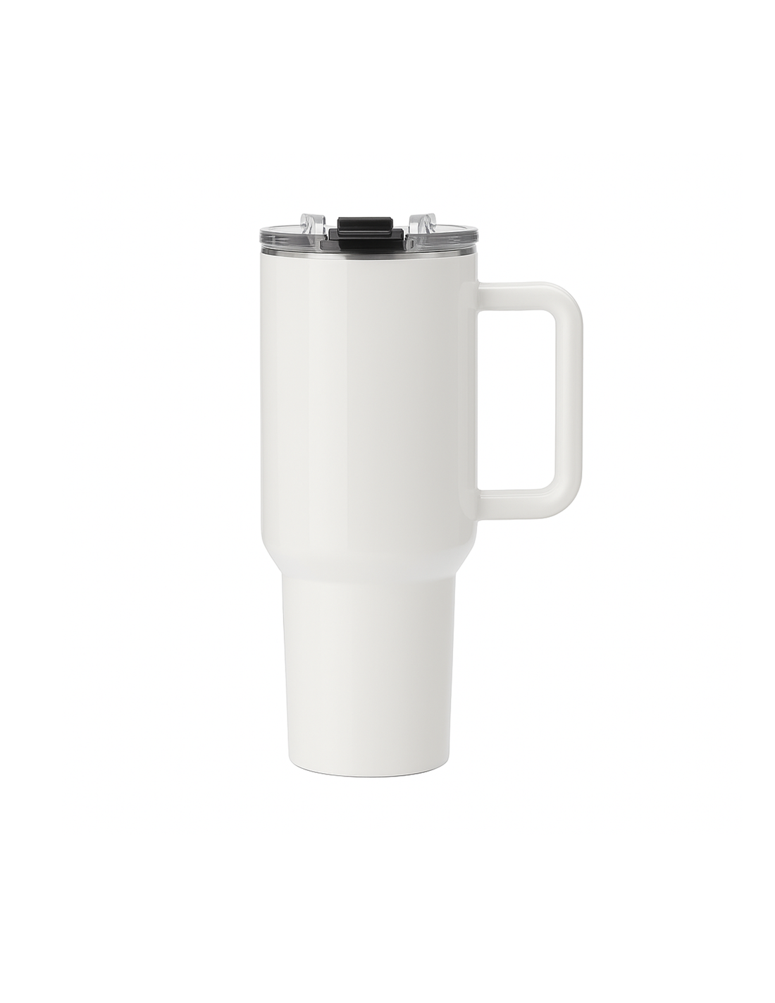 Taza blanca estilo Stanley Cup de 1.18 litros, personalizable mediante la técnica de sublimación. Mide 15 x 25 cm y es de acero inoxidable y asa de plástico.
