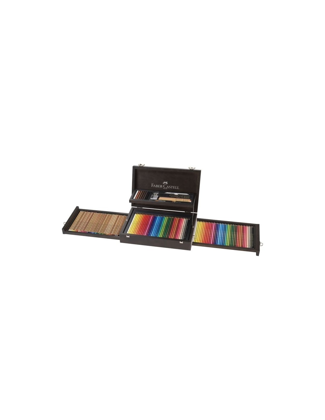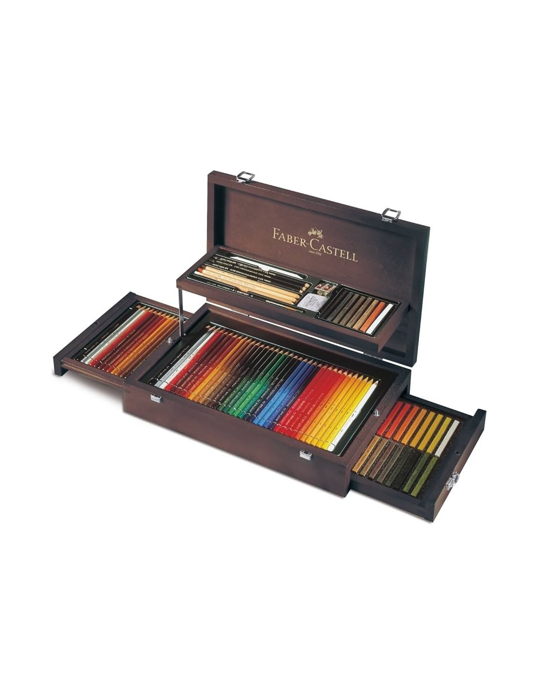 Estuche de madera de color wengué con lápices de pigmento de máxima luminosidad y resistencia, que se disuelven al aplicar agua. Son de trazo suave y vienen protegidos para las roturas. Al ser un maletín que combina técnicas dentro podrás encontrar diferentes gamas de lápices, los polychromos, los acuarelables y los pastel.