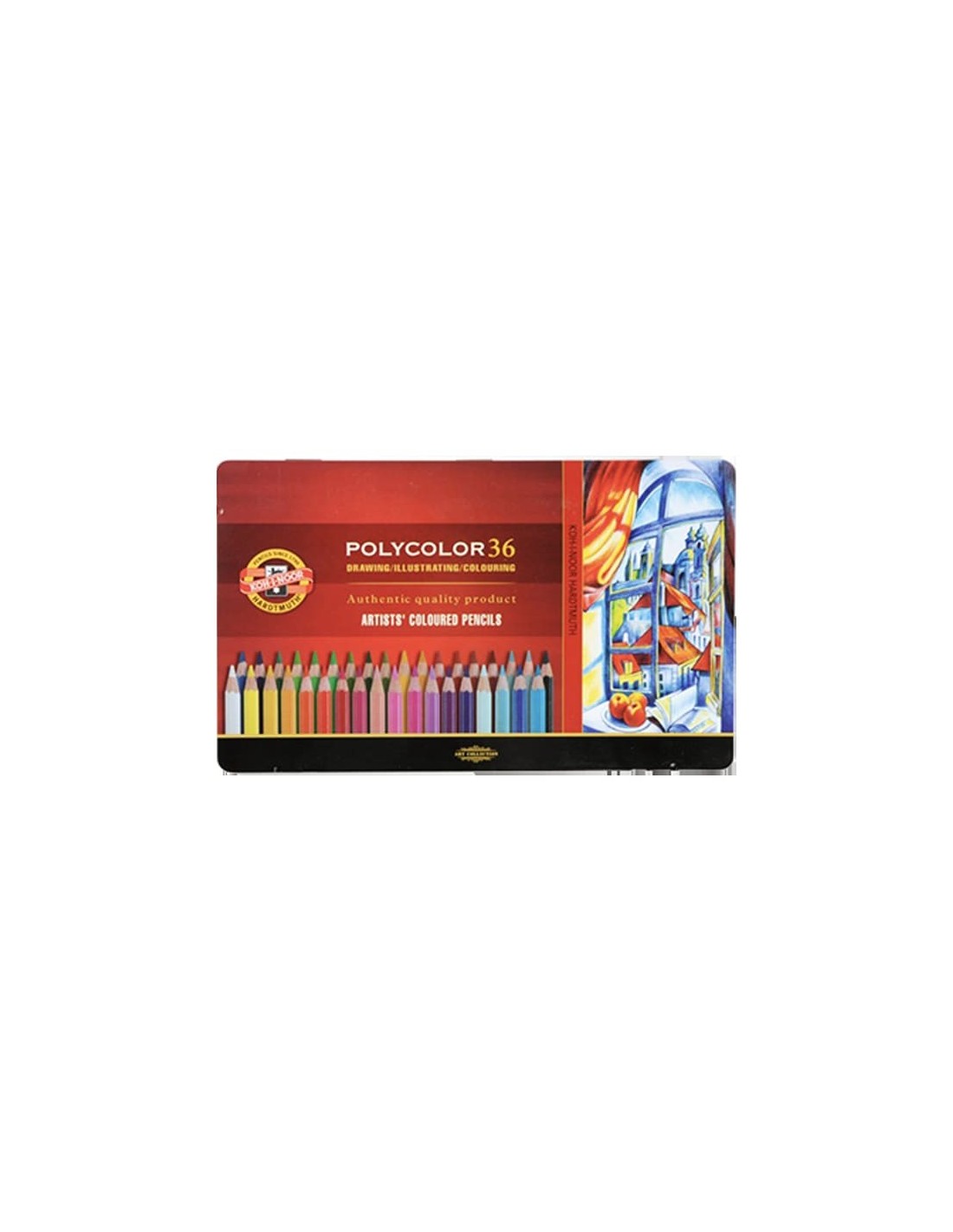 Estuche metálico con 36 lápices de colores permanentes para artistas. Fabricado en la República Checa. Posee una mina altamente pigmentada de 3,8 mm de diámetro. Ofrecen una excelente resistencia a la luz, colores intensos y un trazo aterciopelado resistente al agua. Ideal para dibujo artístico profesional, ilustración y diseño debido a su capacidad de difuminado y alta pigmentación.