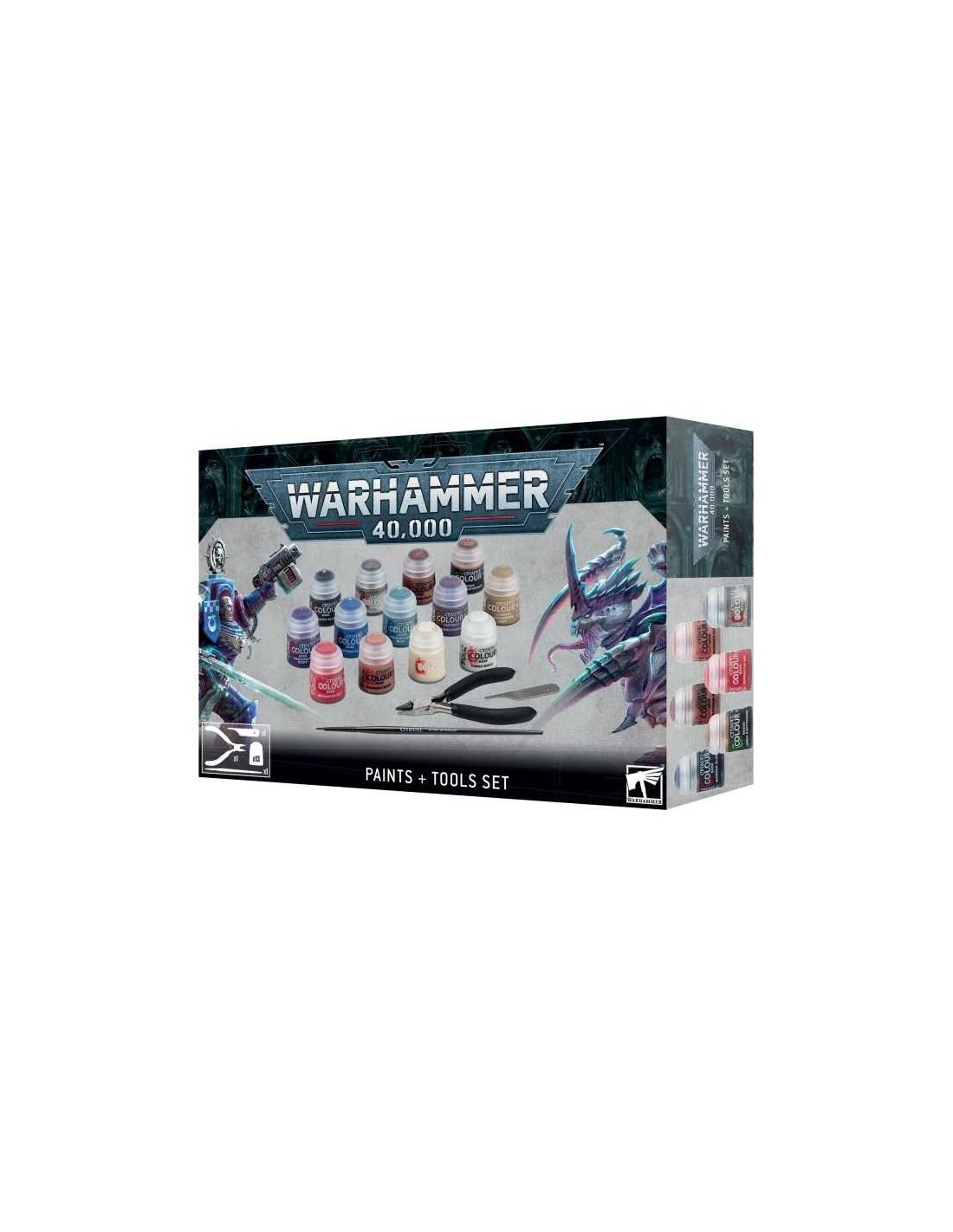 Contiene 1 pincel starter Citadel, 1 tenazas starter Citadel, 1 quitarrebabas Citadel y 13 botes de pintura Citadel Color de 12ml en los tonos Leadbelcher, Bugman's glow, Naggaroth night, Balthasar gold, Wraithbone, Abaddon black, Macragge blue, Armageddon dust, Magos purple, Corax white, Mephiston red, Agrax Earthshade, Thunderhawk blue.